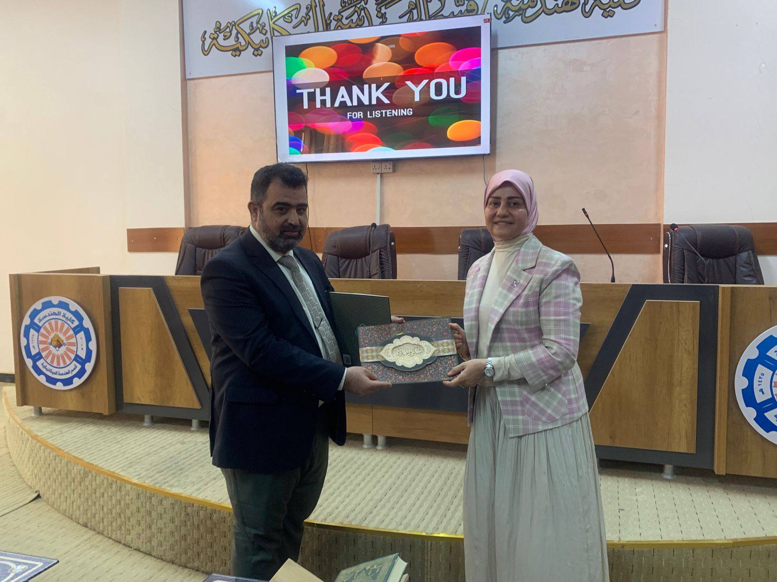 وفي ختام الورشة، قدّمت كلية الهندسة شهادات شكر وتقدير إلى الدكتور أحمد عبدالحسين عطية والدكتورة رشا قصي الجوهر تثمينًا لجهودهما وما قدّماه من معلومات طبية قيمة، مع التأكيد على أهمية استمرار مثل هذه الأنشطة التوعوية لدعم الصحة المجتمعية والجامعية.