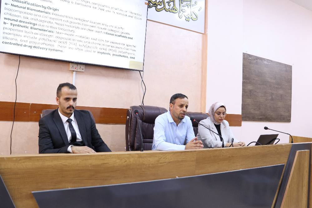 تناولت الندوة التعريف بمفهوم المواد الحيوية وأنواعها واستخداماتها في المجالين الطبي والهندسي، مع التركيز على كيفية تصميمها وتطويرها بما يتلاءم مع احتياجات الجسم البشري. كما تم استعراض أبرز التطبيقات السريرية لهذه المواد في تصنيع الأطراف الاصطناعية وزراعة الأنسجة، فضلاً عن التحديات التي تواجه الباحثين في هذا المجال وسُبل تجاوزها من خلال البحث العلمي والتطوير الصناعي.