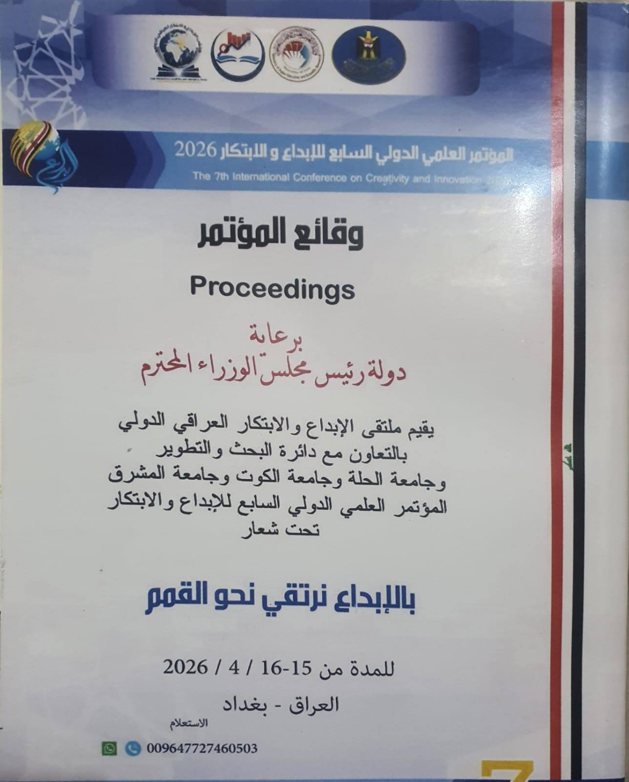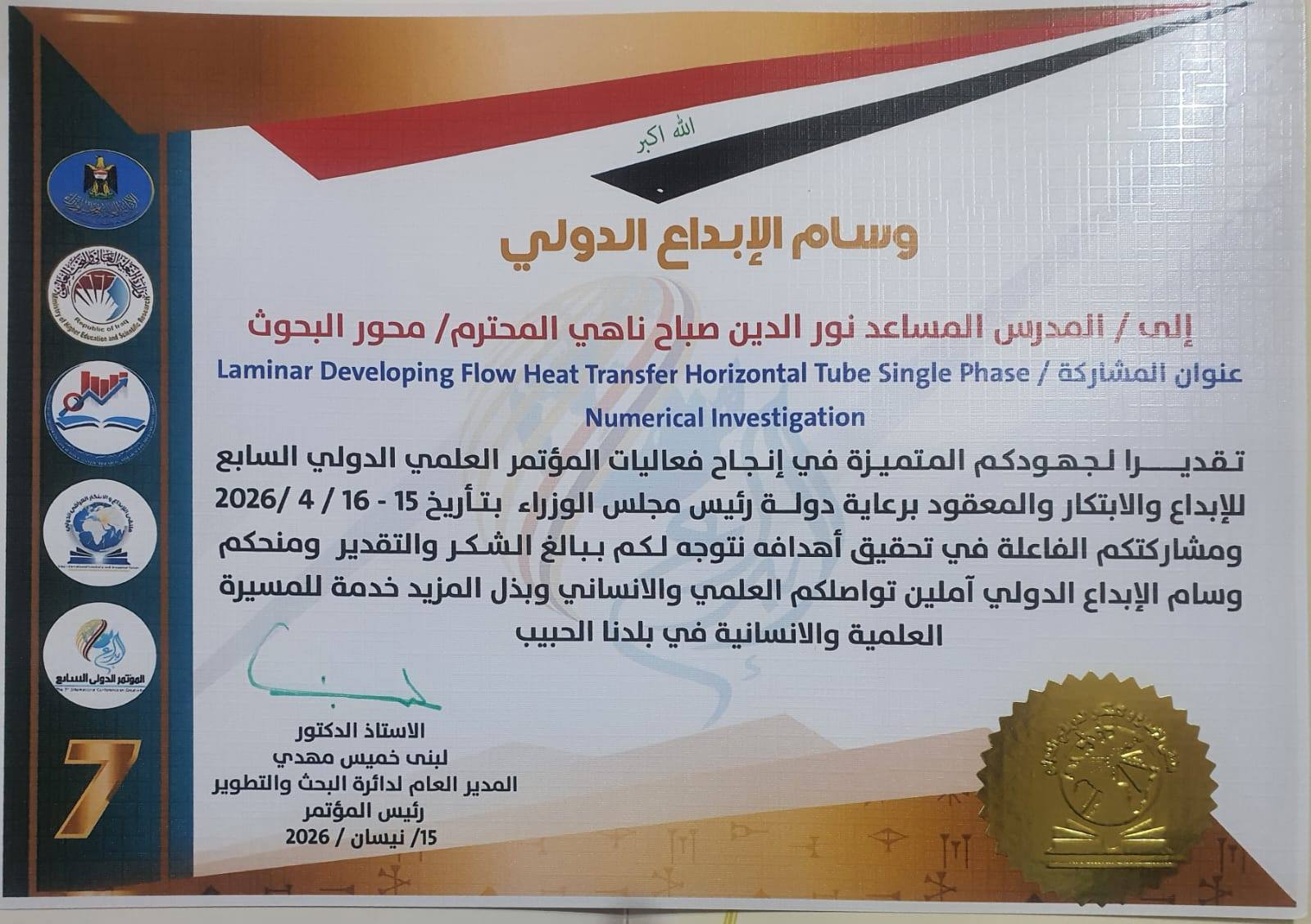شارك المدرس المساعد نور الدين صباح ناهي، التدريسي من كلية الهندسة جامعة ذي قار قسم هندسة الطب الحياتي، ضمن فعاليات المؤتمر العلمي الدولي السابع للإبداع والابتكار، الذي أُقيم تحت شعار (بالإبداع نرتقي نحو القمم) للمدة من 15 – 16 نيسان 2026 في العاصمة بغداد.